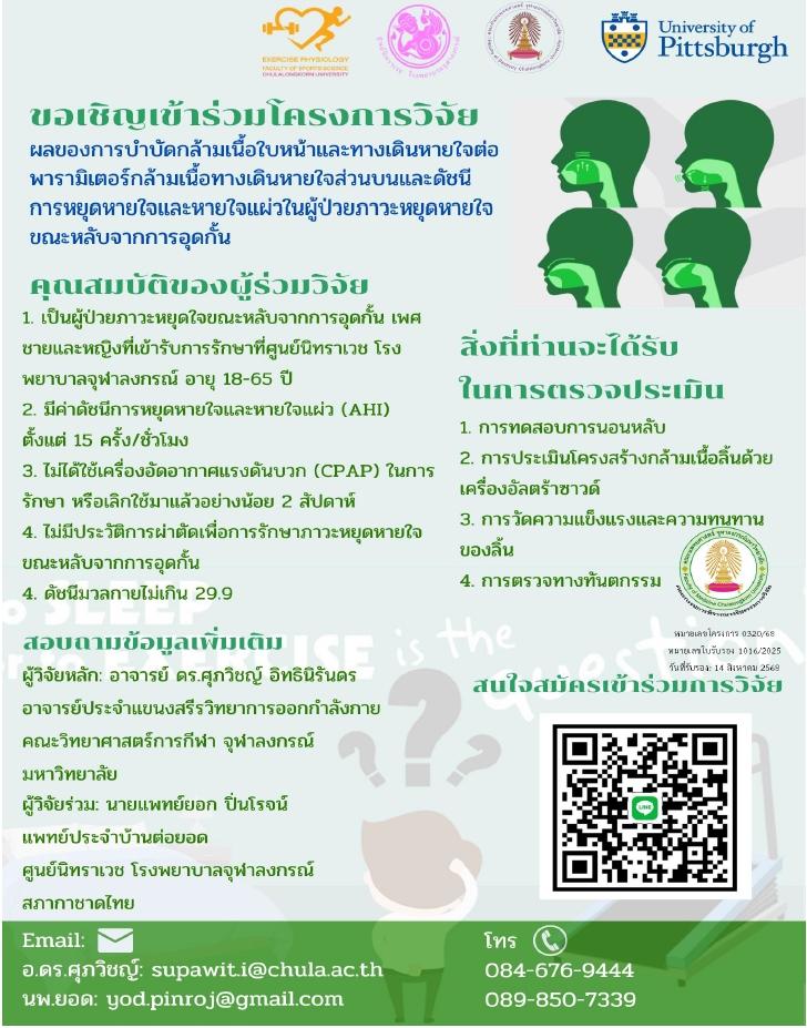 ขอเชิญเข้าร่วมโครงการวิจัย “ผลของการบำบัดกล้ามเนื้อใบหน้าและทางเดินหายใจต่อพารามิเตอร์กล้ามเนื้อทางเดินหายใจส่วนบนและดัชนีการหยุดหายใจและหายใจแผ่วในผู้ป่วยภาวะหยุดหายใจขณะหลับจากการอุดกั้น”